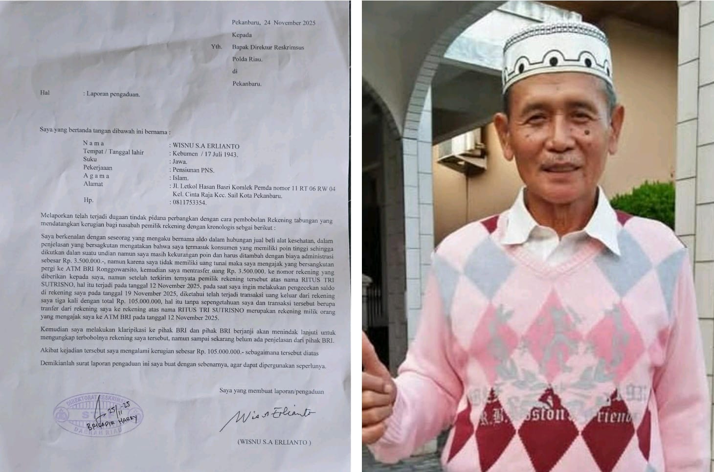 Atas kejadian tersebut, Pak Wisnu ditemani oleh anaknya, telah membuat laporan pengaduan ke pihak Reskrimsus Polda Riau, pada tanggal 24 November 2025 dan laporan pengaduan tersebut diterima dan ditandatangani oleh Brigadir Harry.