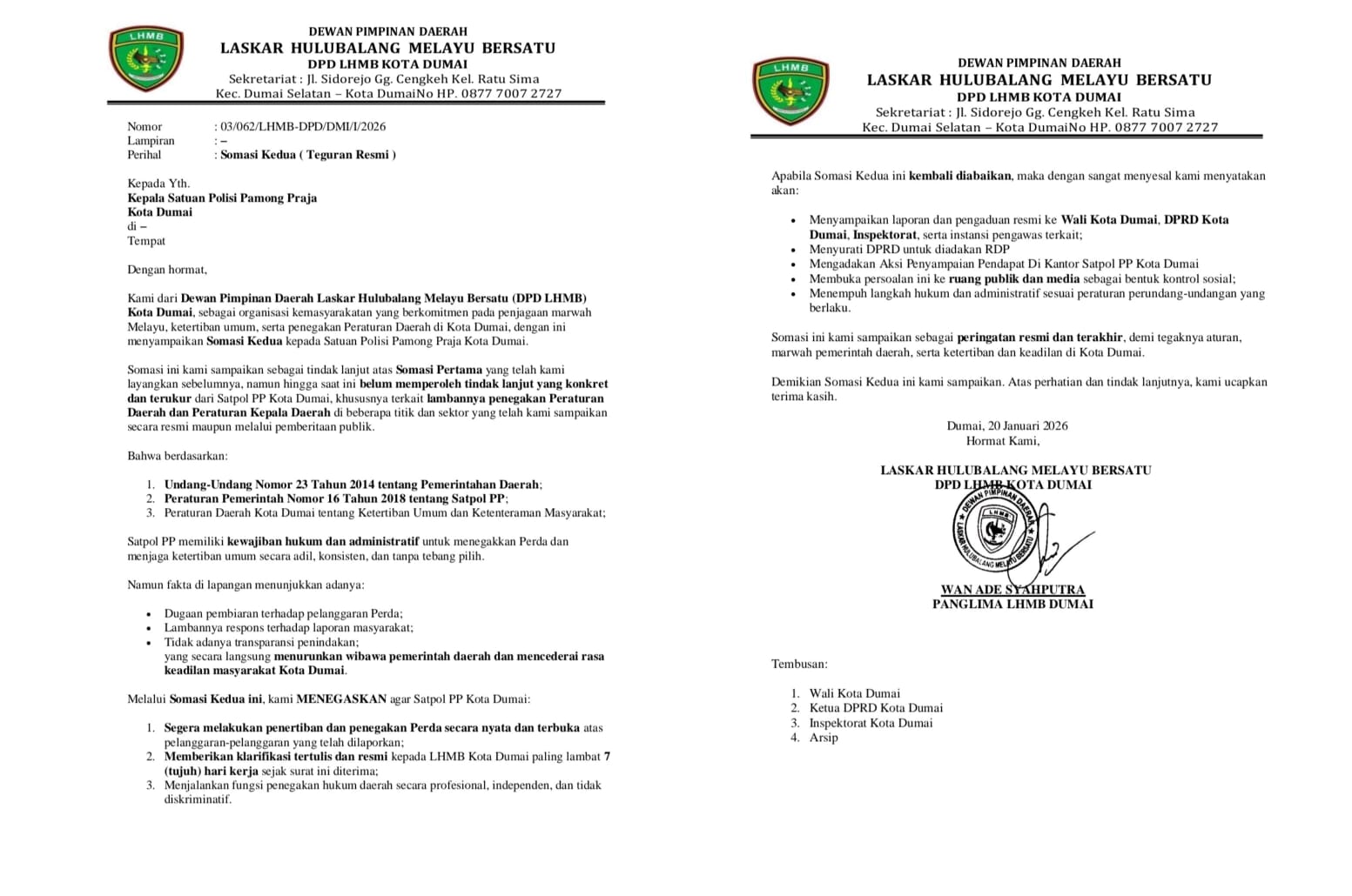 👑Mahkotariau.com- Dumai, [20 Januari 2026] — Laskar Hulubalang Melayu Bersatu (LHMB) secara resmi melayangkan somasi kedua kepada Satuan Polisi Pamong Praja (Satpol PP) Kota Dumai setelah somasi pertama yang berisi permintaan penertiban pelanggaran terhadap Peraturan Daerah (Perda) dan Peraturan Wali Kota (Perwako) tidak mendapat respons maupun tindakan nyata.