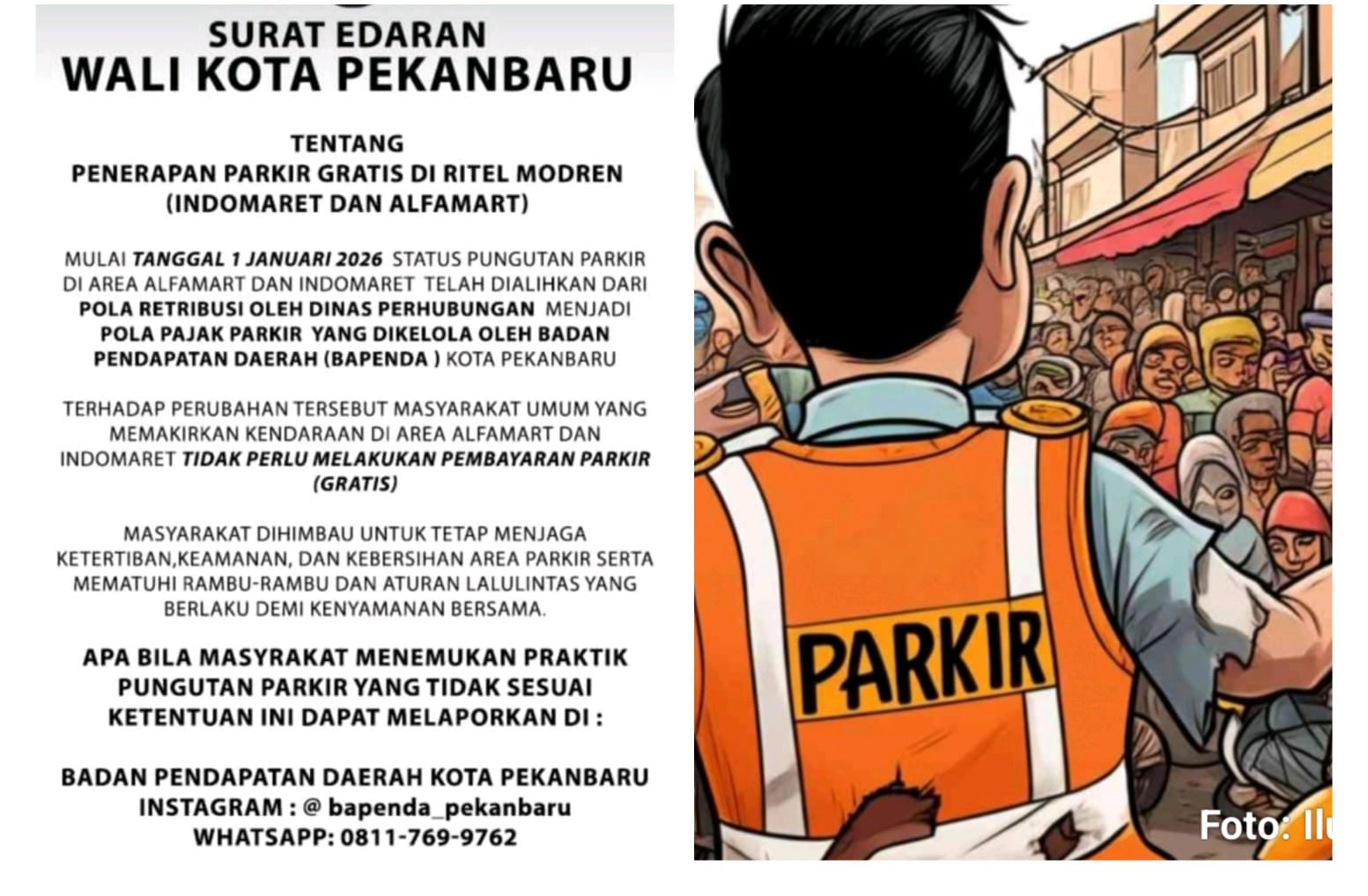 Surat edaran Walikota Pekanbaru Terkait parkir di retail modren Alfamart dan Indomaret berlaku mulai tanggal 1 Januari 2026, kami berharap surat edaran tersebut berlaku juga untuk kami Pengusaha lokal, demi kemajuan usaha lokal dan kemajuan ekonomi pengusaha lokal, tutup Narasumber.